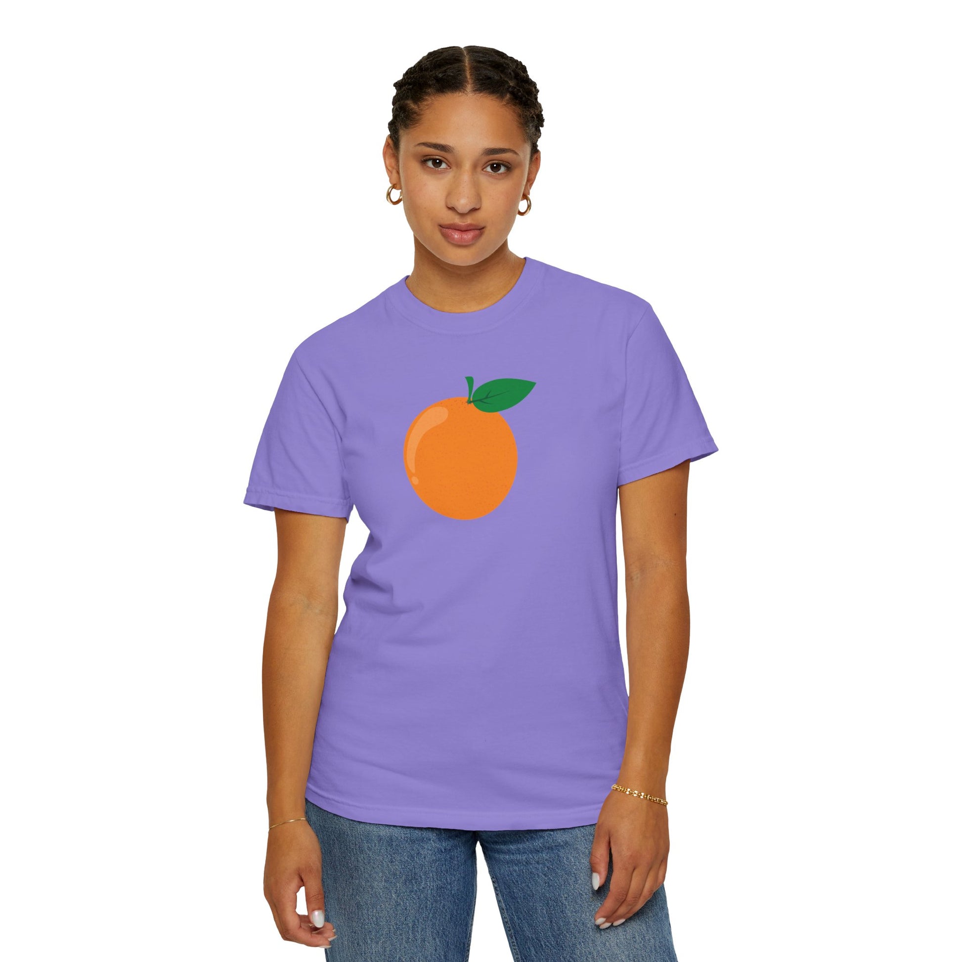 Style Tips: Pair this orange graphic tee with your favorite jeans for a classic casual look, or dress it up with a blazer for creative workspaces. The soft purple backdrop complements the orange design beautifully, making it easy to coordinate with various bottoms and accessories.